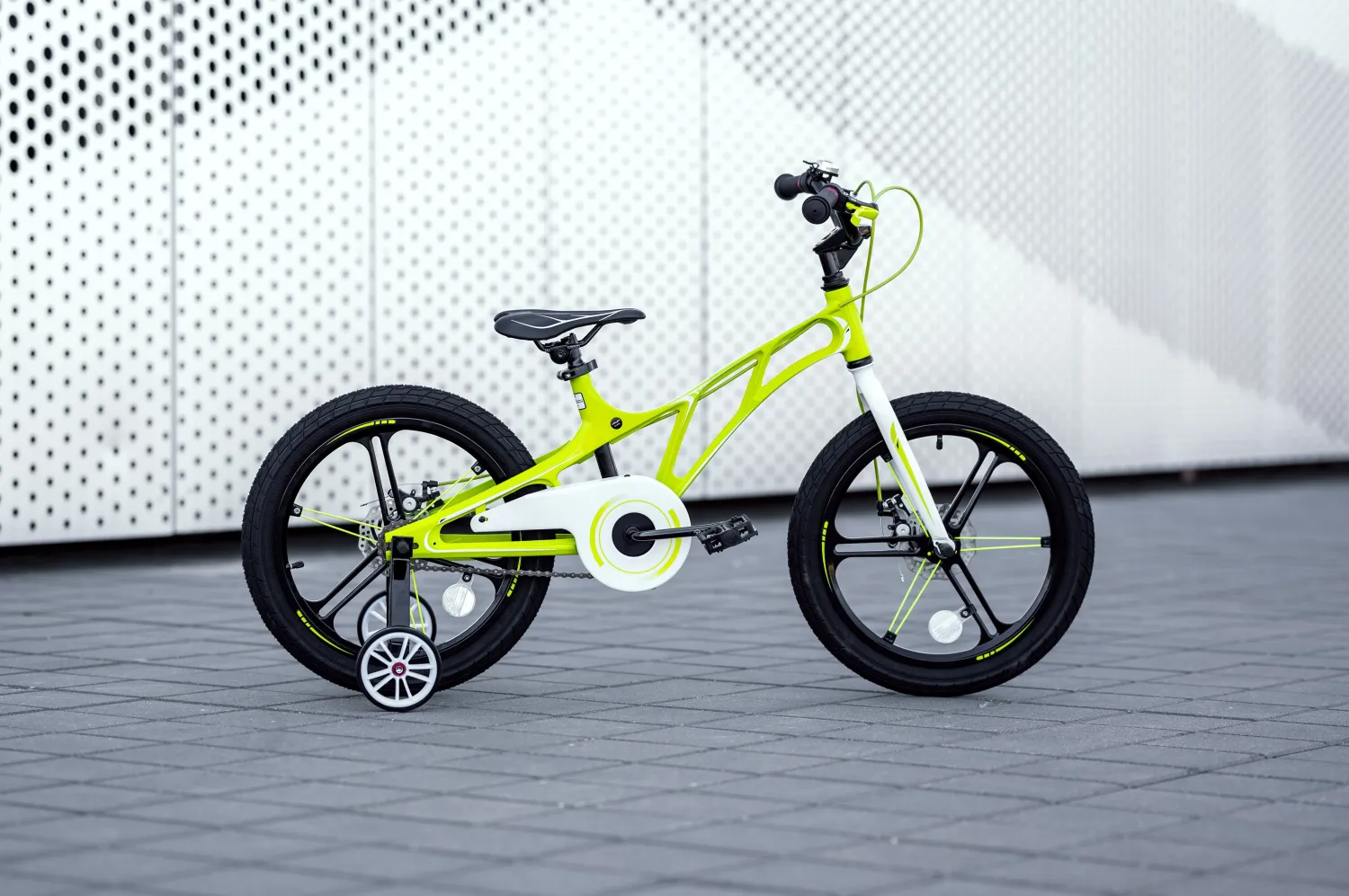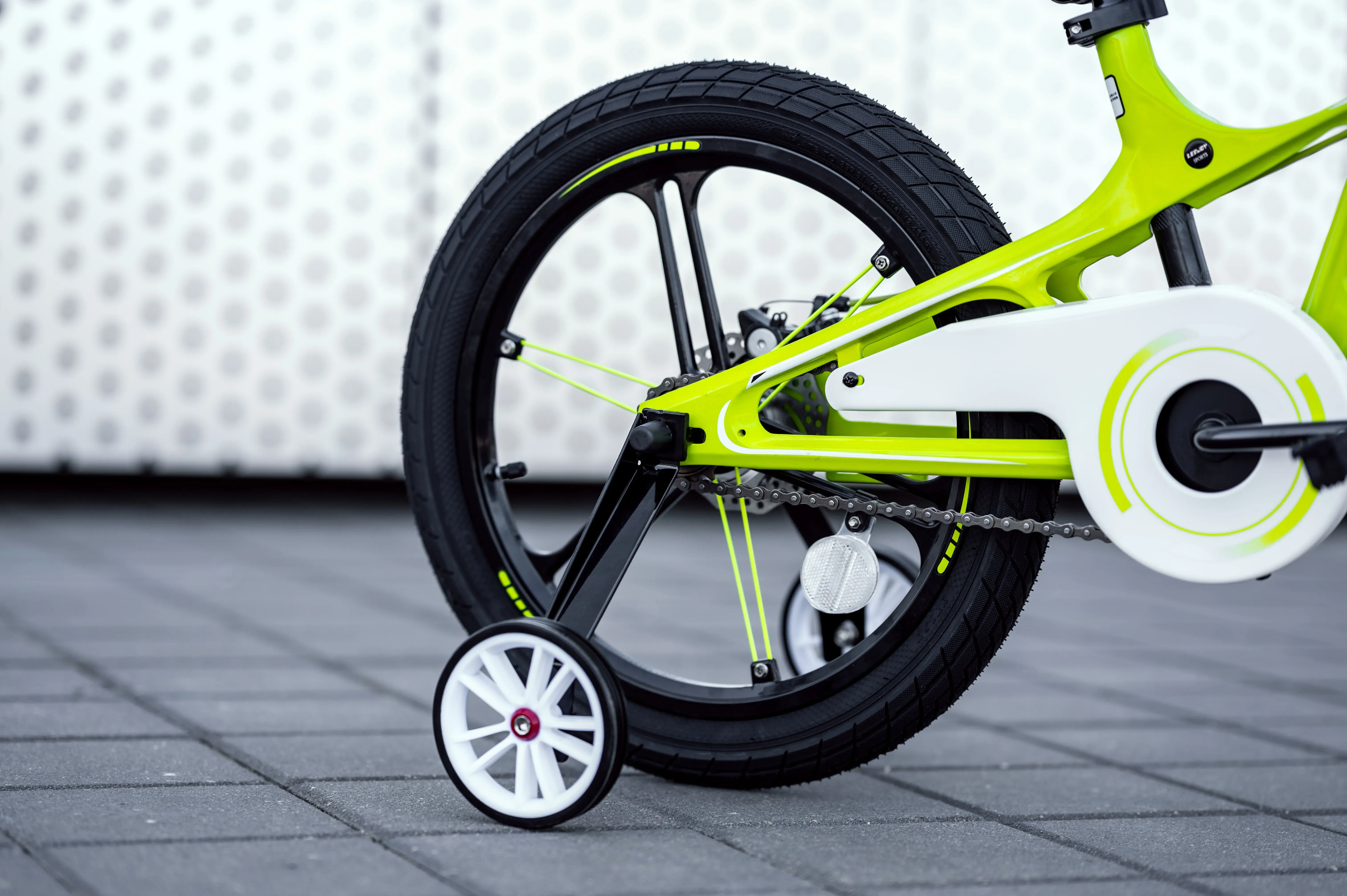 Дополнительные боковые колеса поддерживают ребенка при обучении катанию на двухколесном велосипеде.