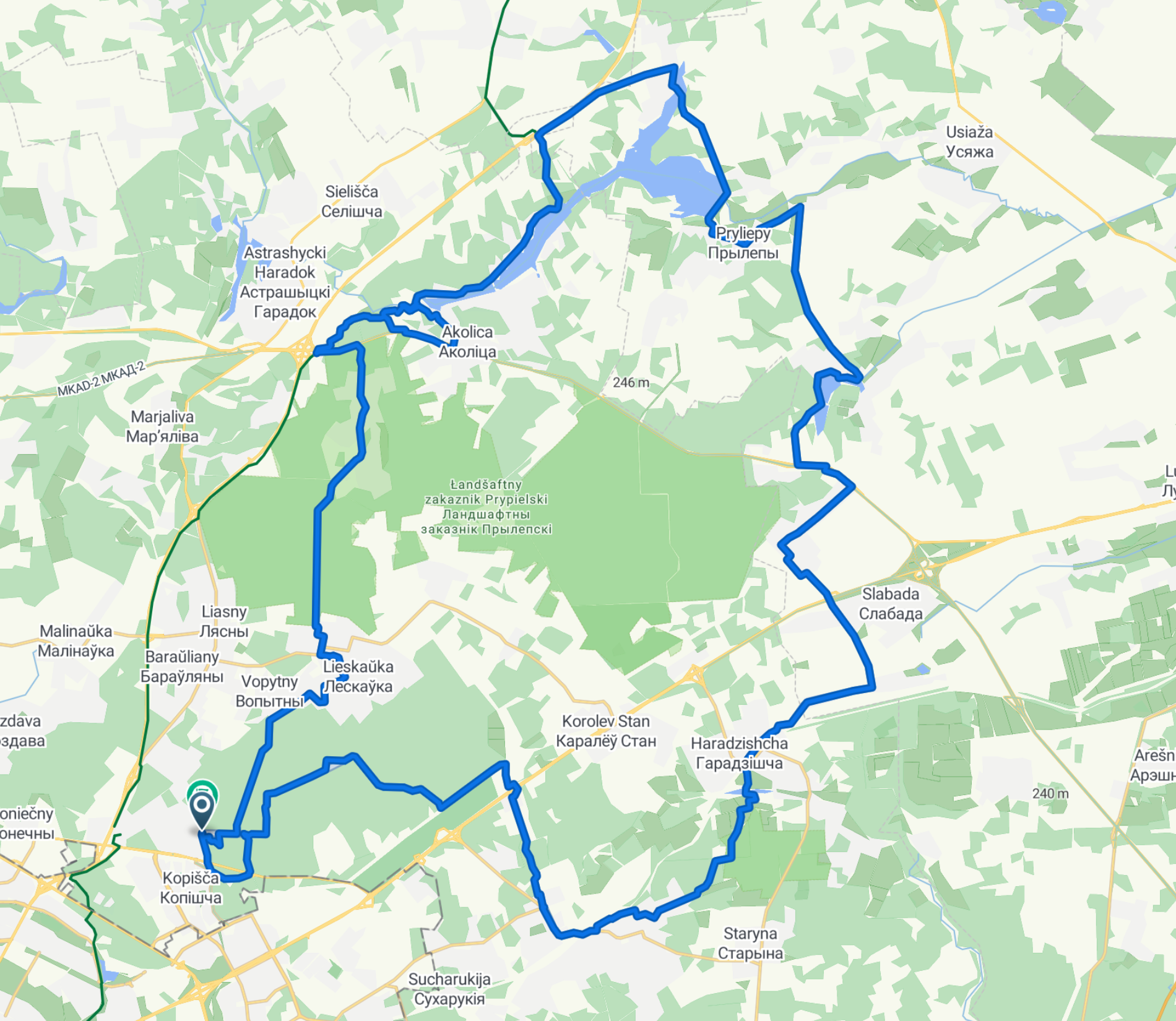 Классический маршрут на северо-восток, начинающийся с легендарных "сисек" в Валерьяново, идущий через боровлянские леса к быстрому и местами опасному спуску в Раубичи, затем вдоль уютного усяжского побережья к Дубровскому водохранилищу и обратно через Задомлю, Слободу и Юзновский заповедник. Маршрут скорее чилловый, чем спортивный, хотя всё становится спортивным если ты достаточно упорот. Есть магазин в Прилепах, Городище и если повезёт — фургончик с морепродуктами "Летучий голландец" возле городищенского ж/д переезда.