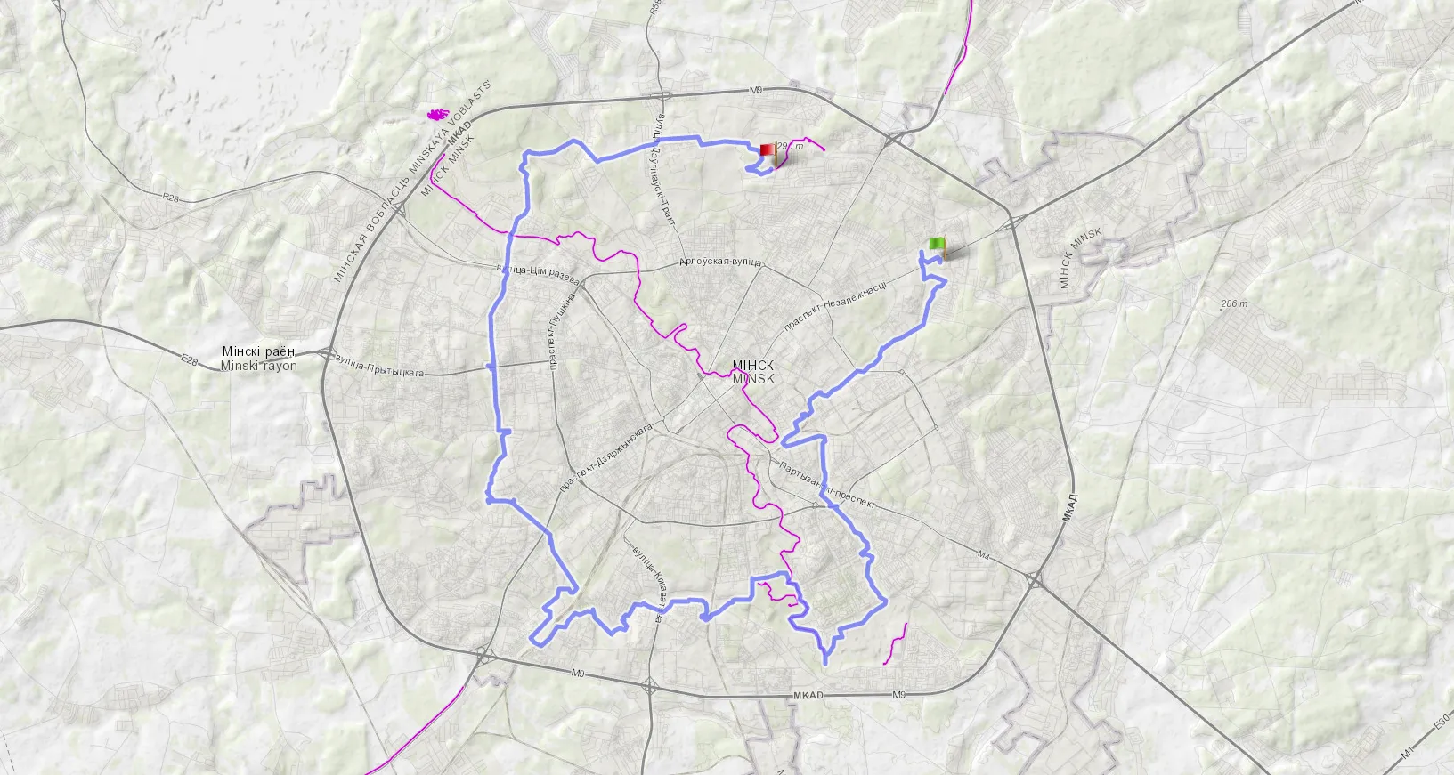 Велосипедный маршрут «Велосипедный тур по Зелёному кольцу г. Минска» продолжительностью 59,75 км.