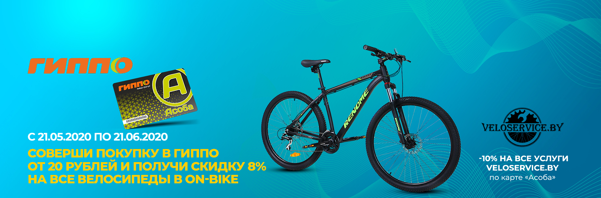 Скидка 10% на veloservice.by действует по карте "Асоба" с 21.06.2020 по 21.11.2020. Подробнее в разделе акции на сайте www.gippo.by